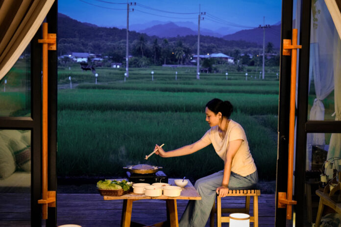 “เขาว่ากันว่า ‘หมูกระทะจะเยียวยาทุกสิ่ง’ แต่พอยิ่งได้มานั่งคีบหมูร้อนๆ ปะทะลมเย็นๆ ริมทุ่งนาช่วงพระอาทิตย์ตกดินแบบนี้ บอกเลยว่ามันคือที่สุด! เสียงจี่กระทะ เคล้ากับเสียงธรรมชาติ บรรยากาศช่วงทไวไลท์ (Twilight) ที่ท้องฟ้าเปลี่ยนเป็นสีน้ำเงินเข้ม ตัดกับแสงไฟอุ่นๆ จากเตา… มันทำให้มื้อธรรมดากลายเป็นมื้อที่พิเศษที่สุด